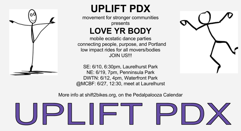 Why do we love bikes so much? Perhaps it's the sense of freedom they bring. Freedom of remembering how strong we are, how capable, how inspired into move. When we move our bodies, we realize our freedom. Dancing and bikes go hand in hand. Join us for this downtown dance party with a spiritual edge. This outdoor, mobile dance party will have us consciously uplifting public spaces, drawing community together, and inspiring collaborative action and joy. Hosted by UpliftPDX.This under <4-mile ride will start at Laurelhurst and end at MultCo Bike Faire. Fun fun times!!
